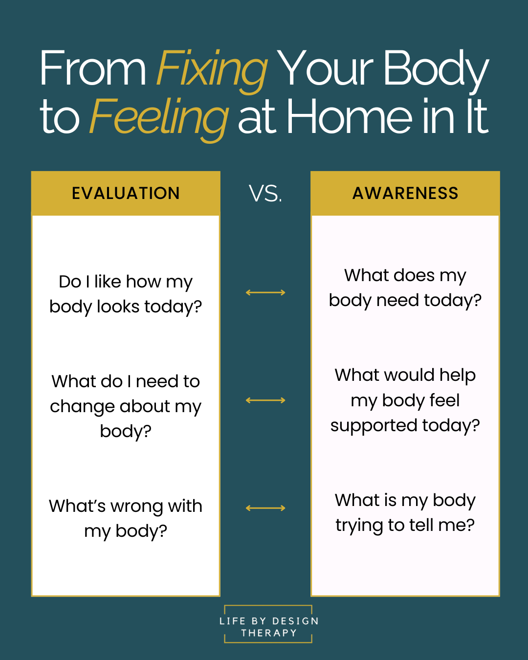 In therapy, we often begin by shifting the focus away from how the body looks and toward how the body is experienced.